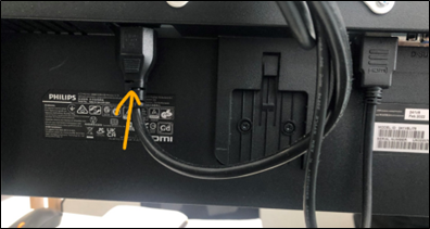Check that the power cable (indicated in the image below) is securely inserted to the screen and the other end of the cable is connected properly to an active power supply. This cable may vary in appearance for different screens, but will always have the opposite end terminate in a power plug.