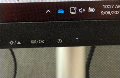 For most screens at DA, if the screen is powered and turned on, there will be a small white or blue light just to the right of the power symbol . If this light is not visible, ensure that the screen is turned on by clicking the small button directly below the power symbol