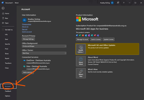 2. Go to File, then Account (or Office Account if you opened Outlook).