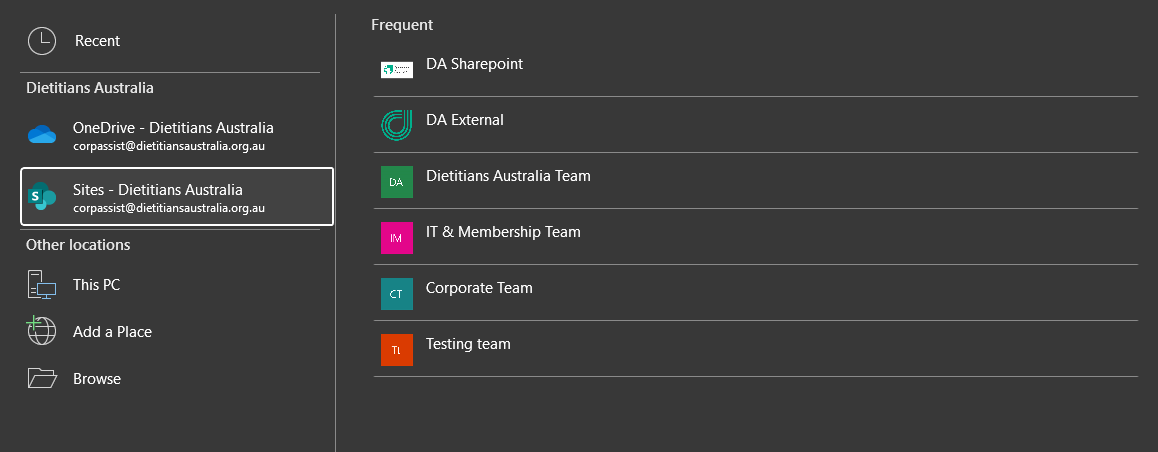 3. Select "Sites - Dietitians Australia" to save to SharePoint. This option will have the green icon with an "S", indicating that it is SharePoint.