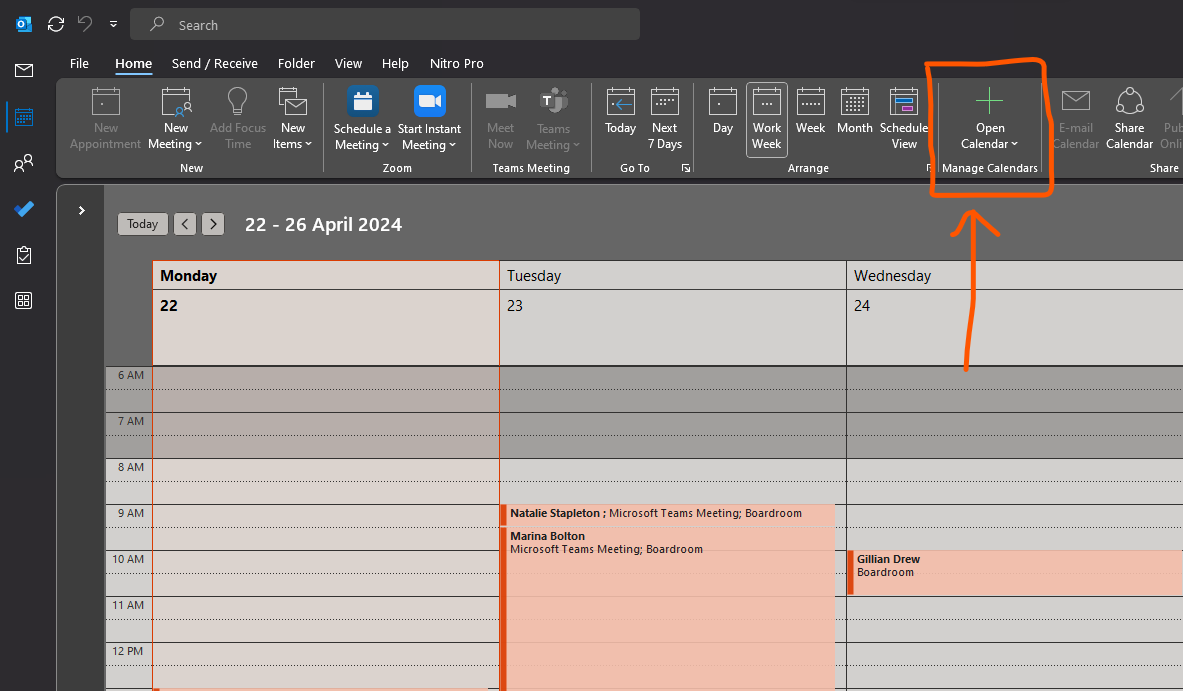 Before setting up a meeting through teams or zoom you will need to ensure the room is not already in use. To see room availability, you can add the Boardroom, meeting rooms or pods to your viewable calendars in Outlook.
