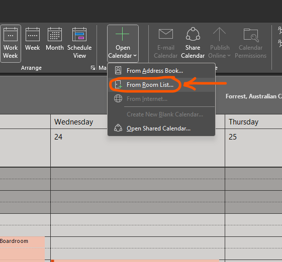 2. Click the drop down arrow on Add Calendar in the ribbon and choose From Room List.
