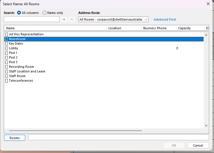 3. Double click the room you would like to add to your calendar, then click OK. In this example we are just adding the Boardroom.