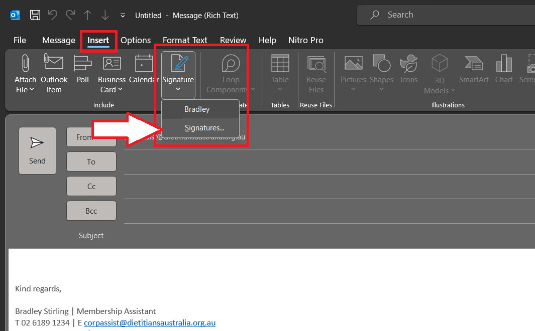2. From the New Email, head to the Insert tab and select Signature then Signatures... to open the signature settings window.
