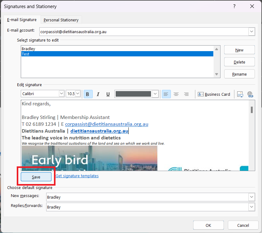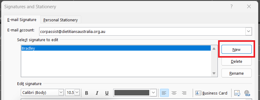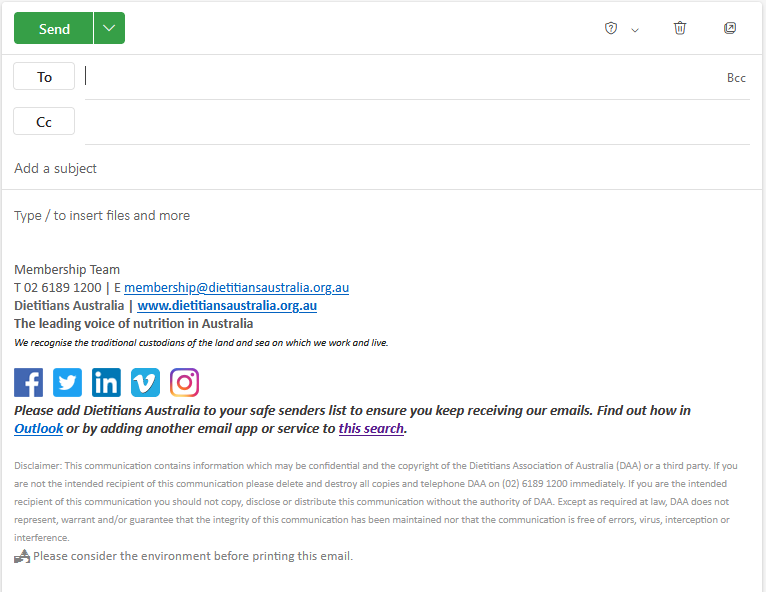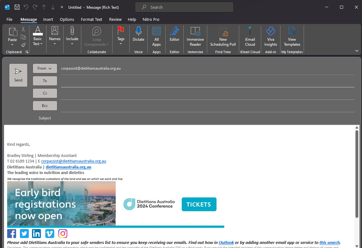The easiest way to get started making a corporate signature, or when needing to refresh one with new campaign links, is to copy a standard Dietitians Australia signature from another staff member's recent email, paste into a new empty email, edit with your name, position, and contact information, then copy it to your clipboard afresh before you go to signature settings.