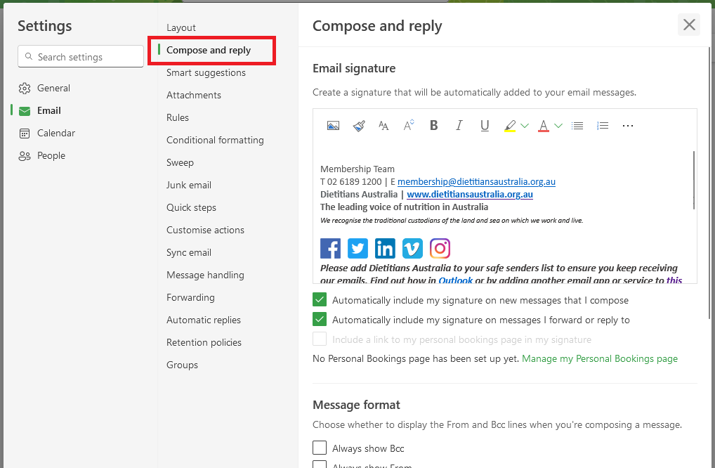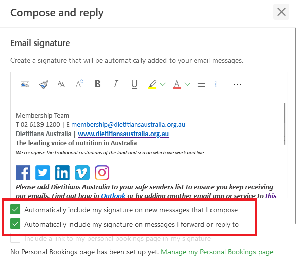 4. In the text box, enter the content for your signature. The easiest way to add a corporate signature is to copy a standard Dietitians Australia signature from another staff member's email, update the name, position, and contact information to your information, then paste into this editor. To include on all emails, tick the boxes Automatically include my signature on new messages that I compose and Automatically include my signature on messages I forward or reply to.