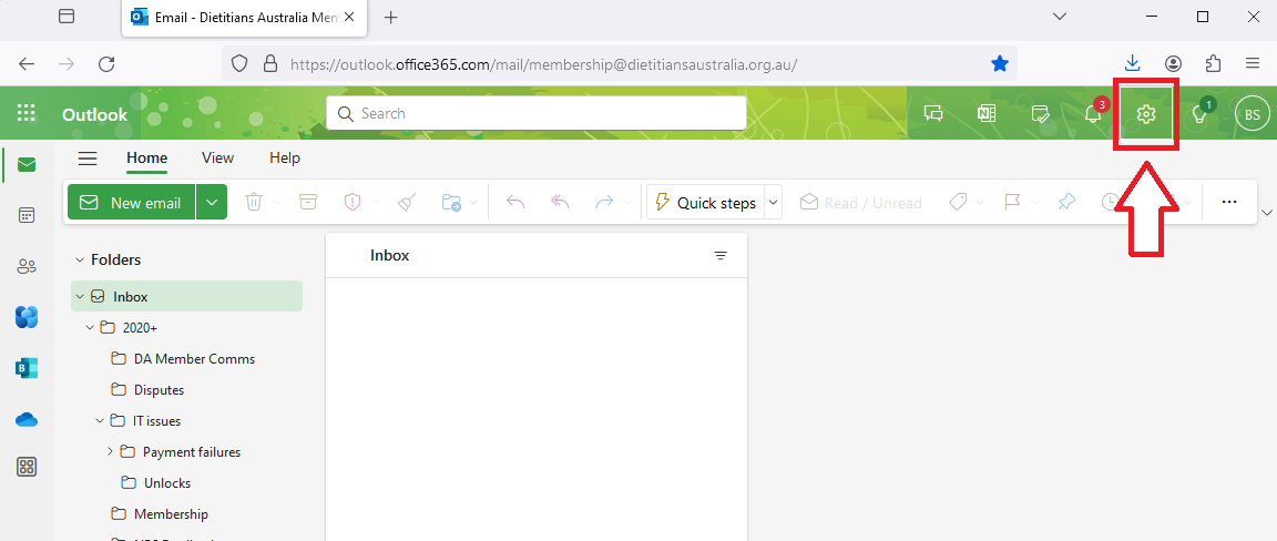 2. Click the Settings gear icon in the top right corner of the page to access Outlook settings.